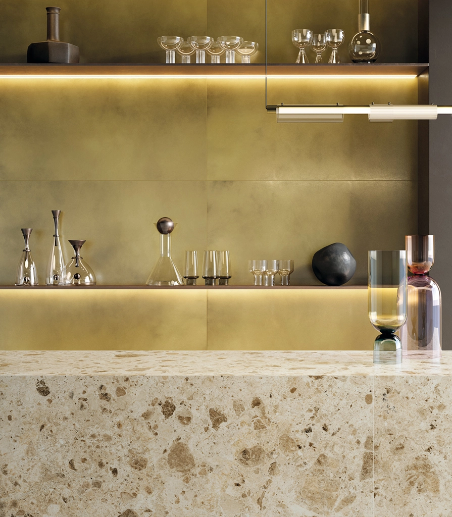 The Silver floor gives this lounge a sober and harmonious atmosphere while the Petrol walls, the Brass Gold niches and the Stone Beige counter add colour and give an original touch of style to the room.