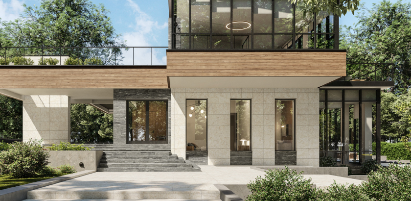 Porcelain stoneware is a great solution for decorating not only the interiors of a house, but also its exteriors. It can be used to create curtain-wall ventilated facades that will be very beautiful and practical, and will also help make the building more energy efficient. Both classic and special thickened 20 mm porcelain stoneware are used for facade cladding. This can be found in the X2 range, which is presented in several Italon collections. It is characterized by increased strength, impact resistance, durability and fire safety. This material is not afraid of sudden temperature fluctuations, exposure to solar radiation, moisture or frost, which makes it an excellent choice for use in exteriors.