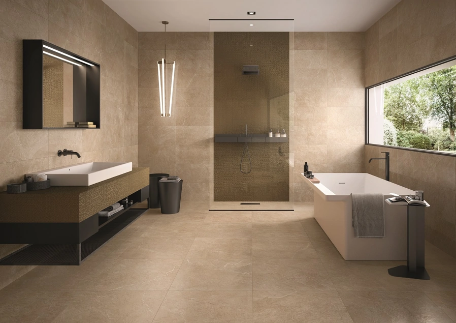 Stone effect porcelain stoneware with minimalist graphics is perfect for modern interiors with an emphasis on natural textures and natural materials.