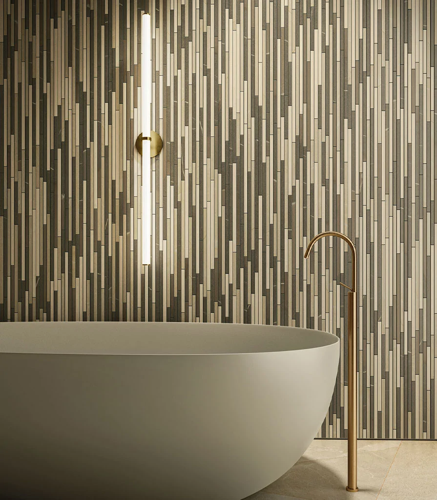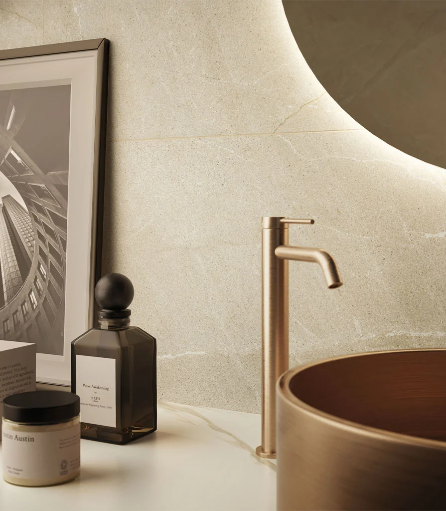 Desert Beige is a stone design porcelain stoneware that fills a bathroom with cosiness. Its warm tone with delicate stringers creates an atmosphere of harmony and comfort in the room. The 60x120 tile format is a practical solution for the bathroom, and the beige Strip Warm decoration on the wall will add a touch of elegance.