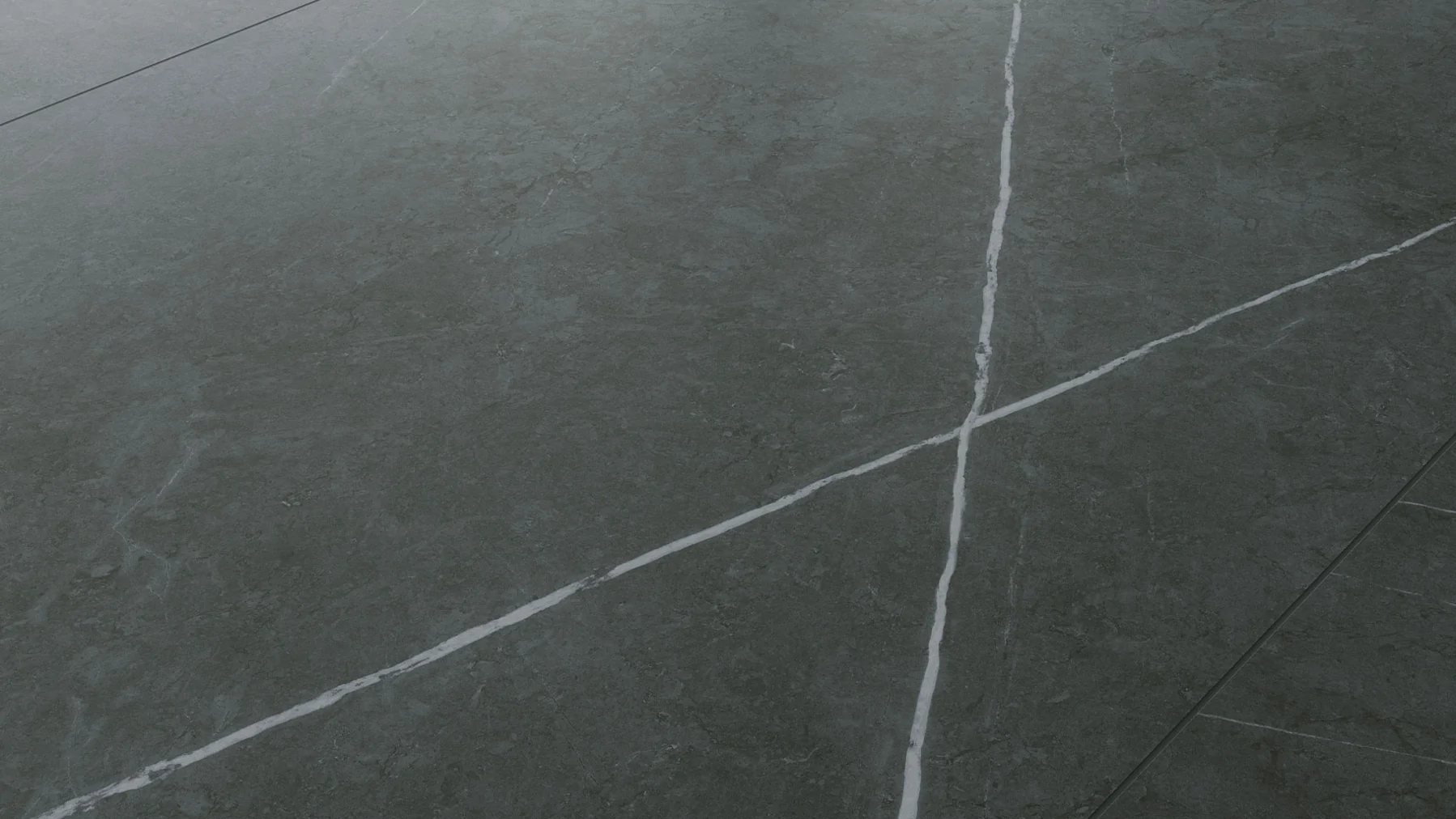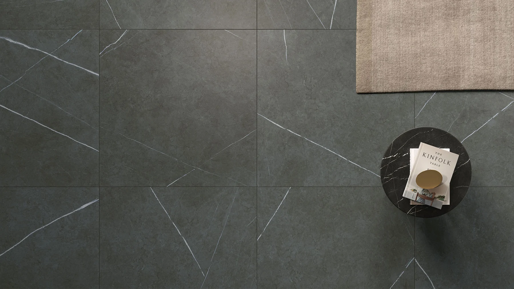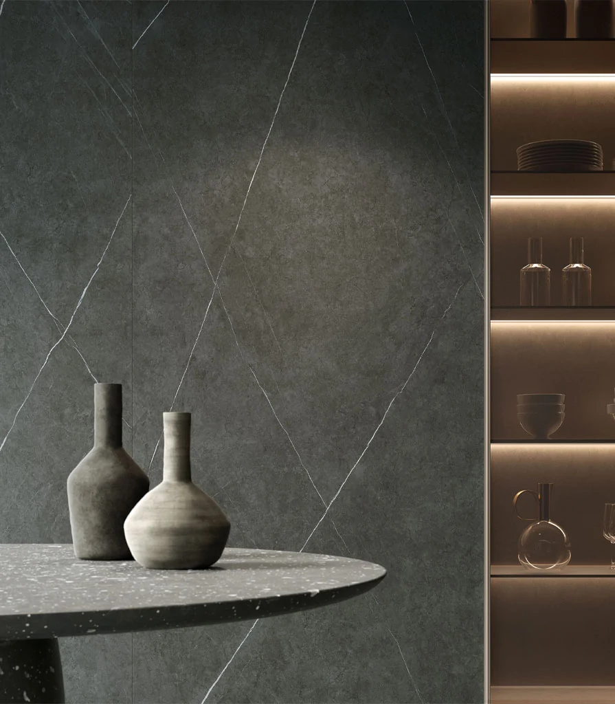 This living room-kitchen interior fully reveals the expressiveness of the dark grey Imperial Black porcelain stoneware. The stone effect tiles in 80x80 format on the floor fill the space with elegance, while porcelain stoneware tiles in 120x278 maxi format on the walls emphasise its geometry.