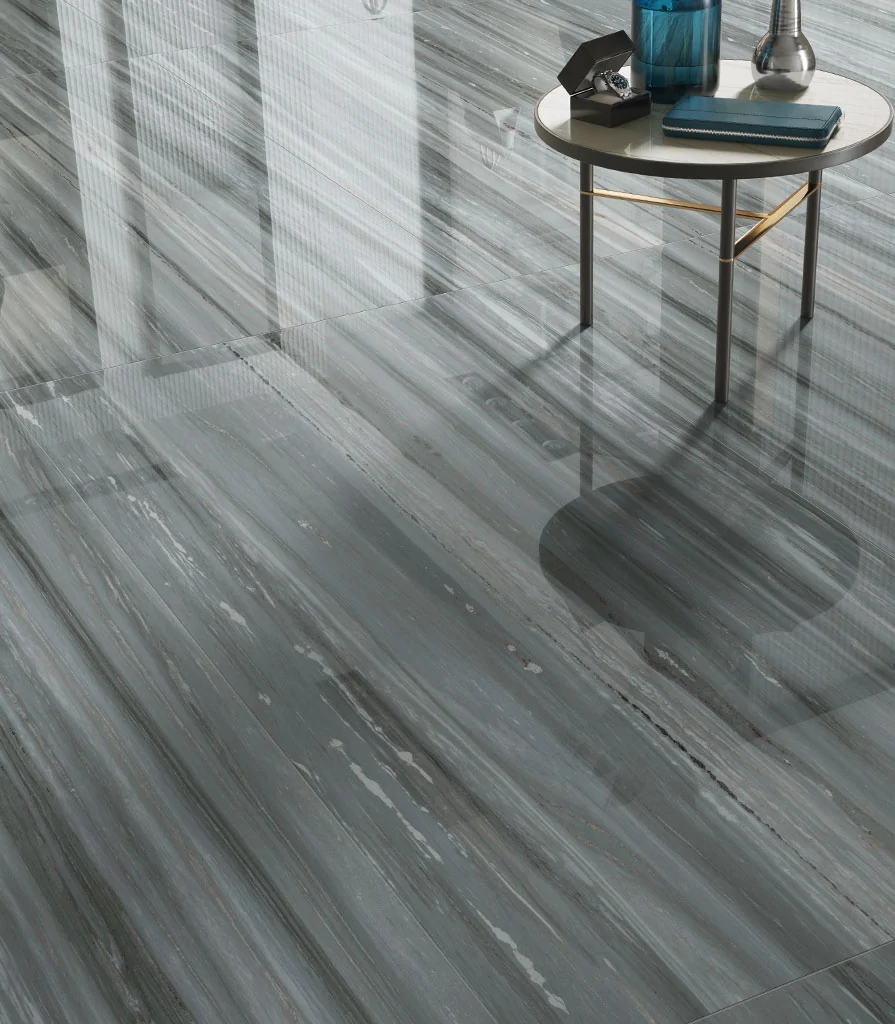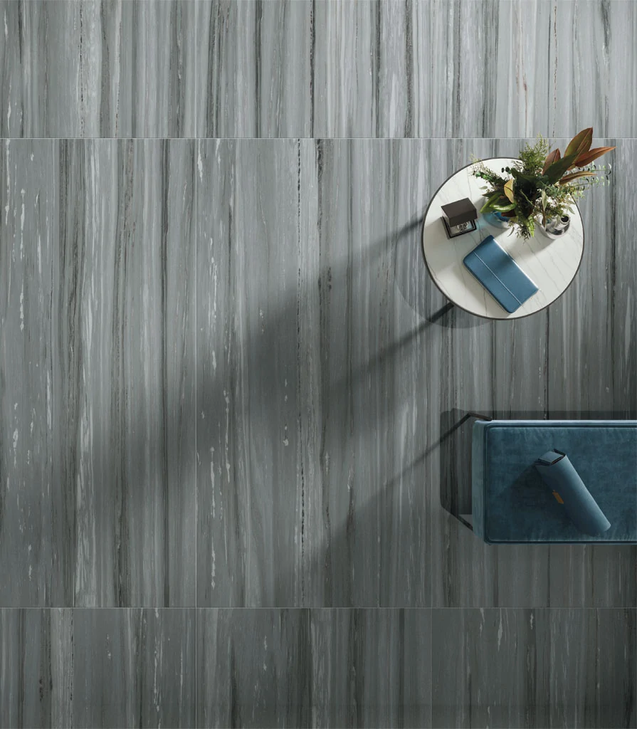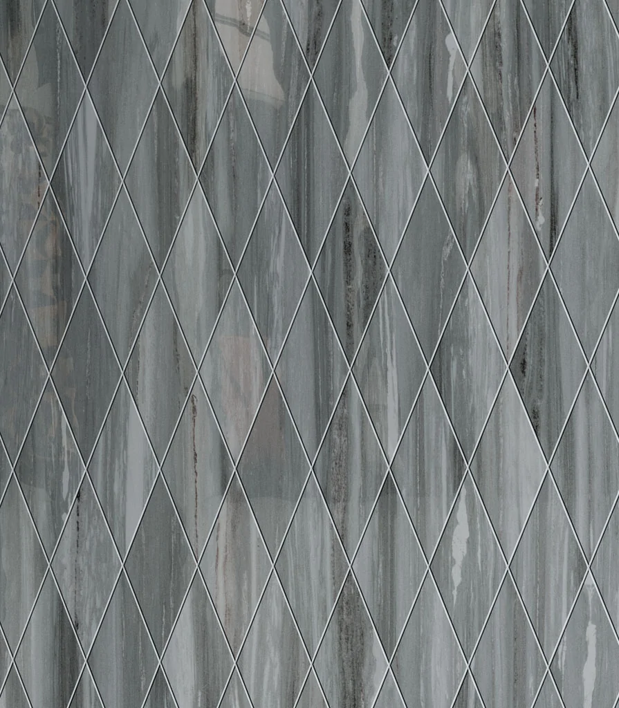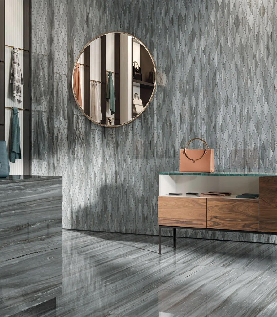 L’interno di uno spazio commerciale deve fare colpo. Il gres porcellanato 80х160 nel colore Palissandro Dark con il suo inconfondibile motivo di venature unidirezionali è ideale per il design di boutique garantendo loro grande respiro. Le venature in grigio brillante delle lastre effetto marmo su un tenue sfondo color cenere rendono unico lo spazio, mentre il mosaico Palissandro Diamond impreziosisce l’ambiente e ne accresce l’importanza.