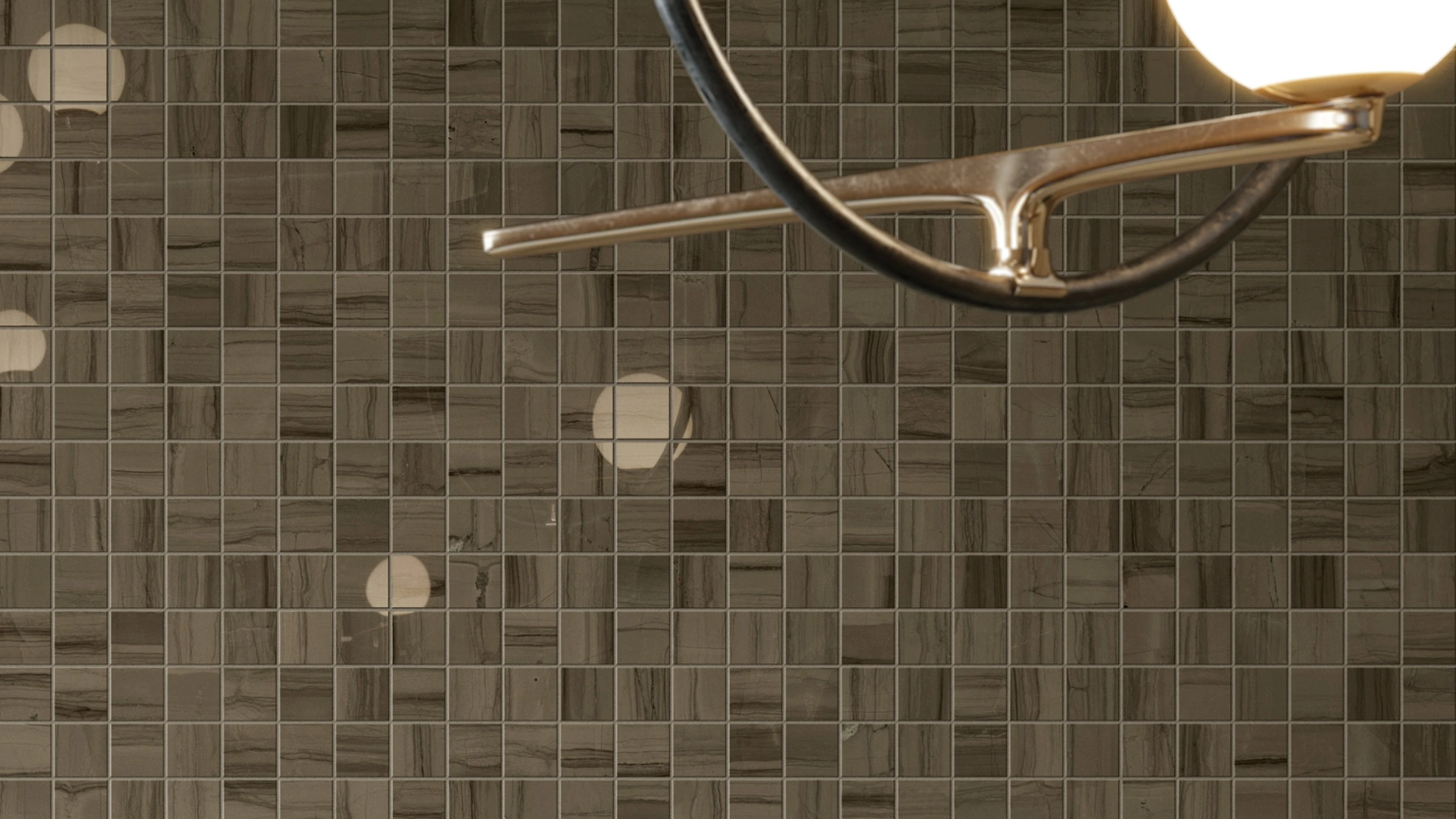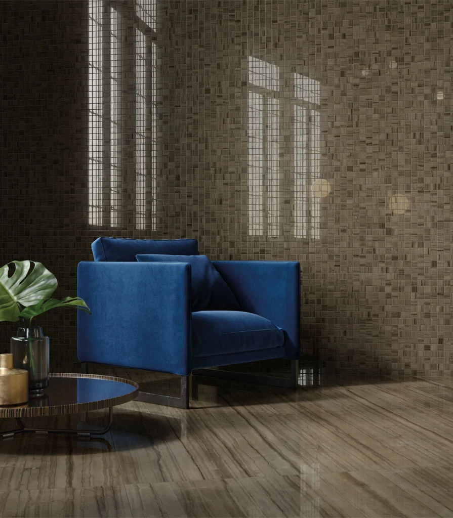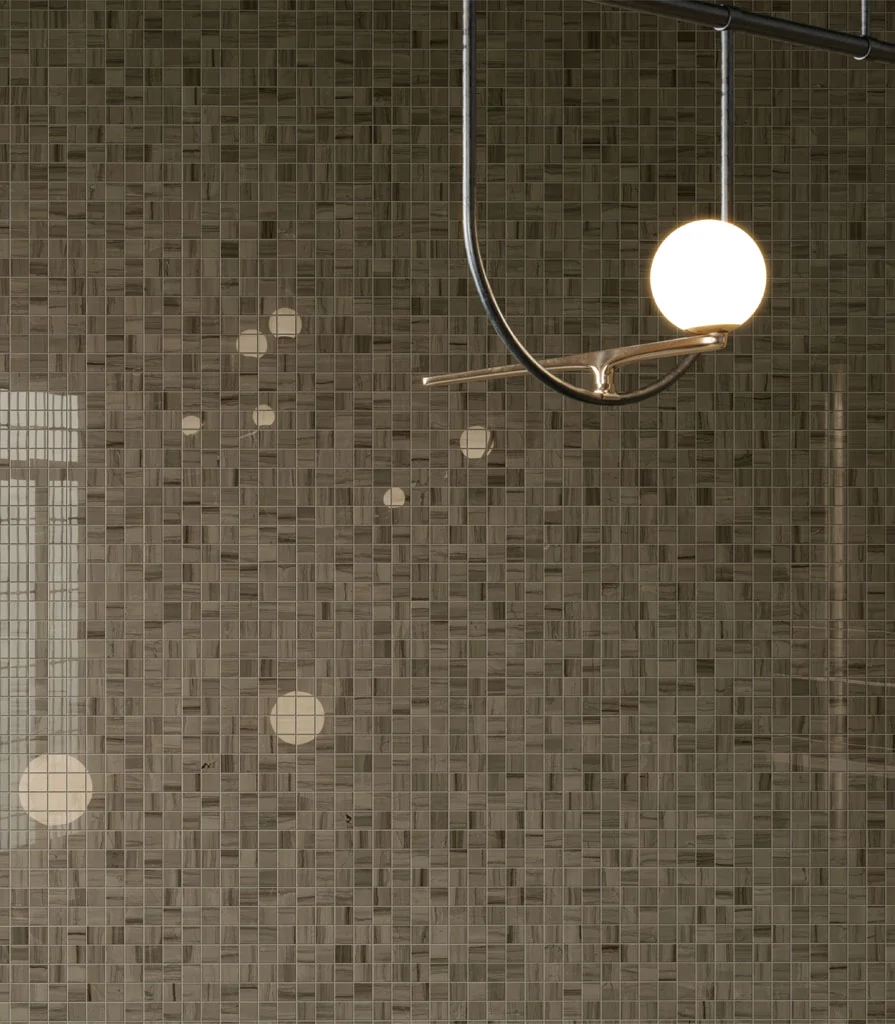 L’utilizzo del colore bruno ha un bell’effetto sia in ambienti di natura privata che commerciale. La lastra scura effetto marmo dalla grafica accattivante Elegant Brown ha arricchito il progetto della hall. Il colore bruno intenso, esaltato dalle chiare venature geometriche, permette di attuare soluzioni di design esclusive e di immergersi in un’atmosfera di comfort. Il gres porcellanato di grande formato 80х160 a finitura naturale per la pavimentazione si combina ottimamente con il mosaico Lux creando un interessante gioco di luce.