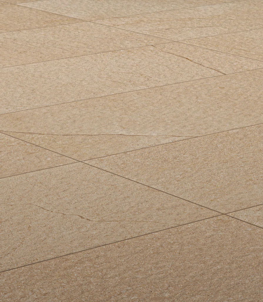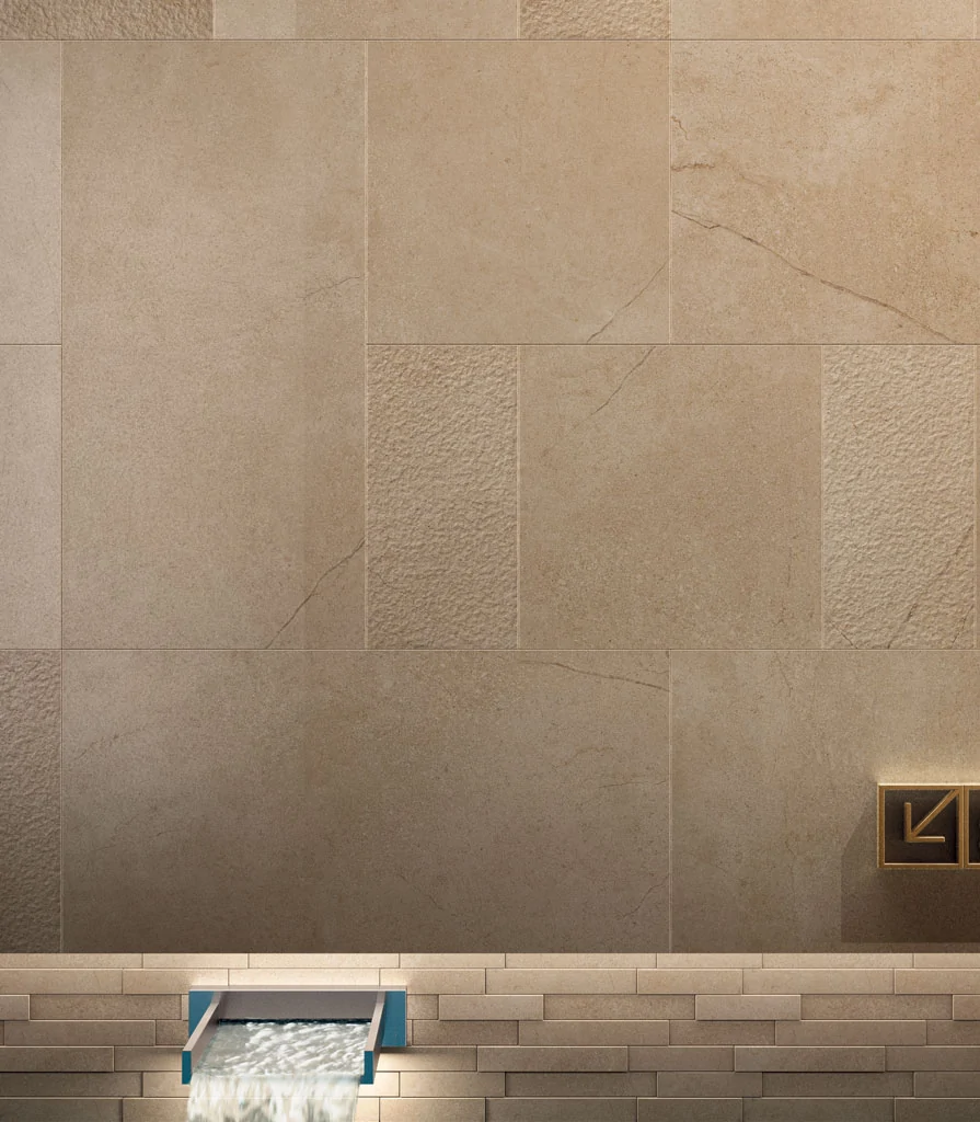Gli interni della spa sono realizzati in una gamma cromatica calda con finiture in cui predominano texture naturali. Il gres porcellanato beige effetto pietra Flare, con le sue dolci venature, risulta essere l’elemento chiave del design. Sulla parete nell’area piscina sono posati tre diversi formati, precisamente 60х120, 60х60 e 30х60, in finitura cerata e grip. Nella nicchia è posato il decoro Brick 3D che enfatizza ulteriormente la bellezza della pietra naturale. Per rivestire il pavimento si è scelto il formato 30х60, finitura grip. La finitura strutturata e antiscivolo della piastrella fa spiccare la texture della pietra e assicura un alto grado di sicurezza in tutto lo spazio wellness. Le scale poste tra le varie zone della spa sono realizzate con gradini in gres in colore Flare.