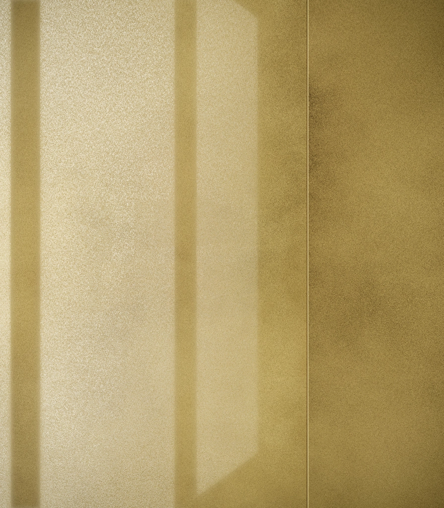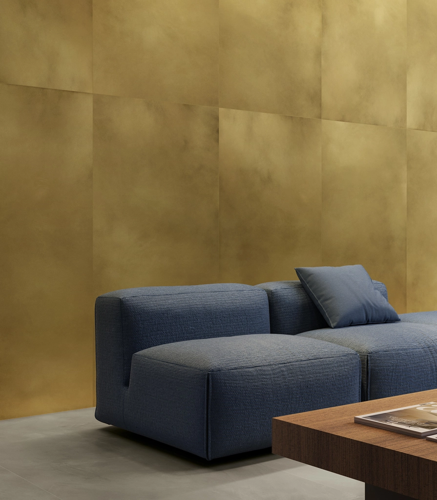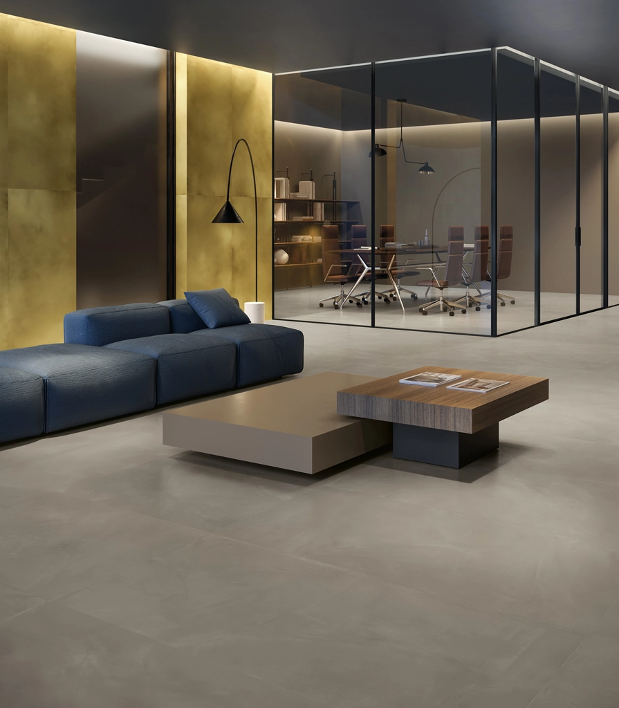 L’effetto spatolato di Iron si estende in questo ambiente business con morbida naturalezza. Una zona di passaggio dove Brass Gold amplifica il carattere dello spazio con i suoi riflessi dorati.