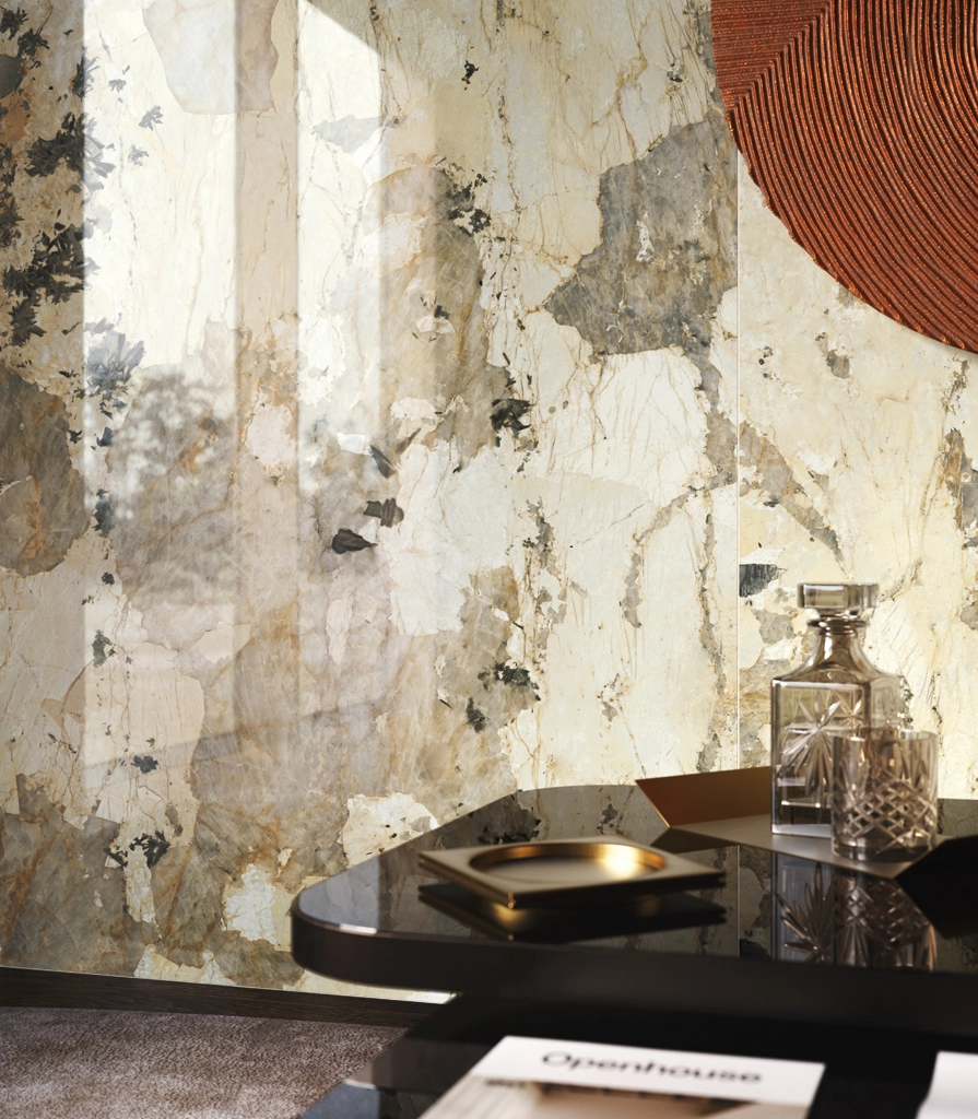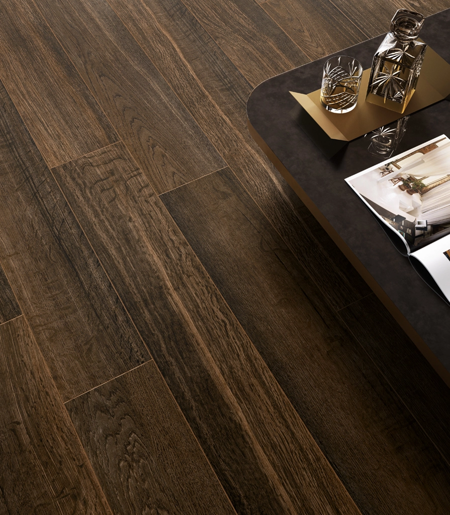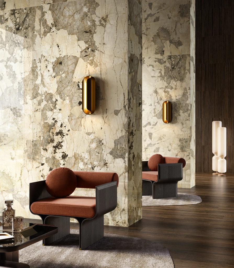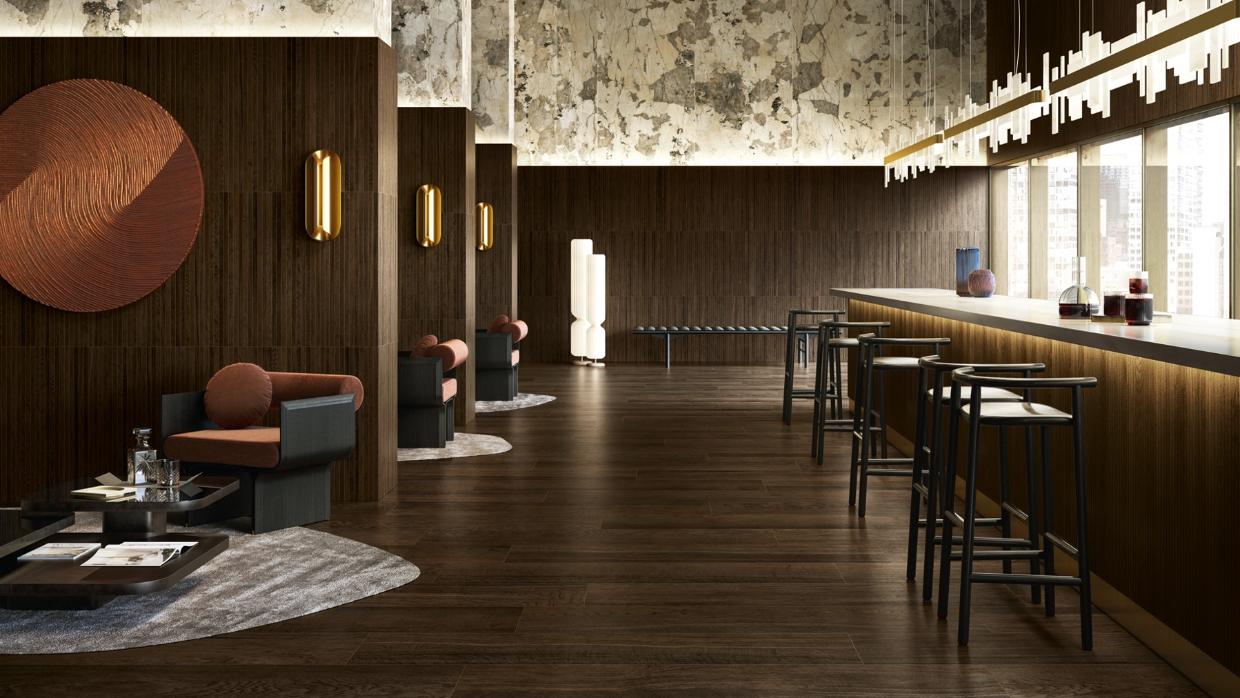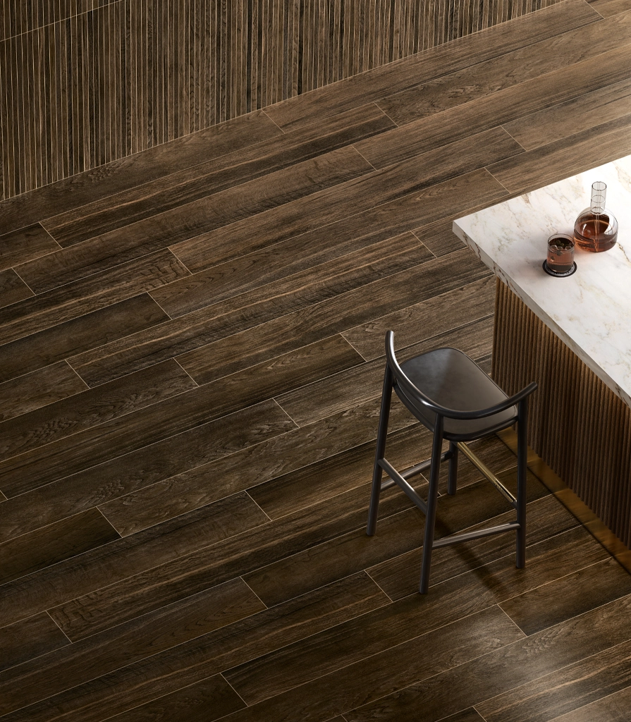 Nel design del ristorante, il gres porcellanato Mogano si abbina armoniosamente al decoro effetto listelli di legno Tatami e alla piastrella lucida effetto marmo Volcano nel grande formato 120x278.