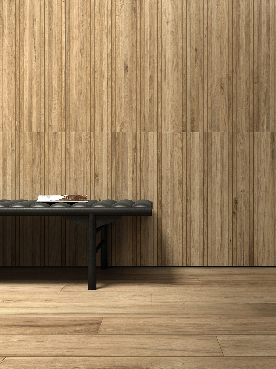 La presenza di nodi e venature, dal contrasto cromatico accentuato, esaltano la particolarità e l’esclusività di questo materiale. La struttura lavorata restituisce il calore e la tradizione della lavorazione manuale del legno.