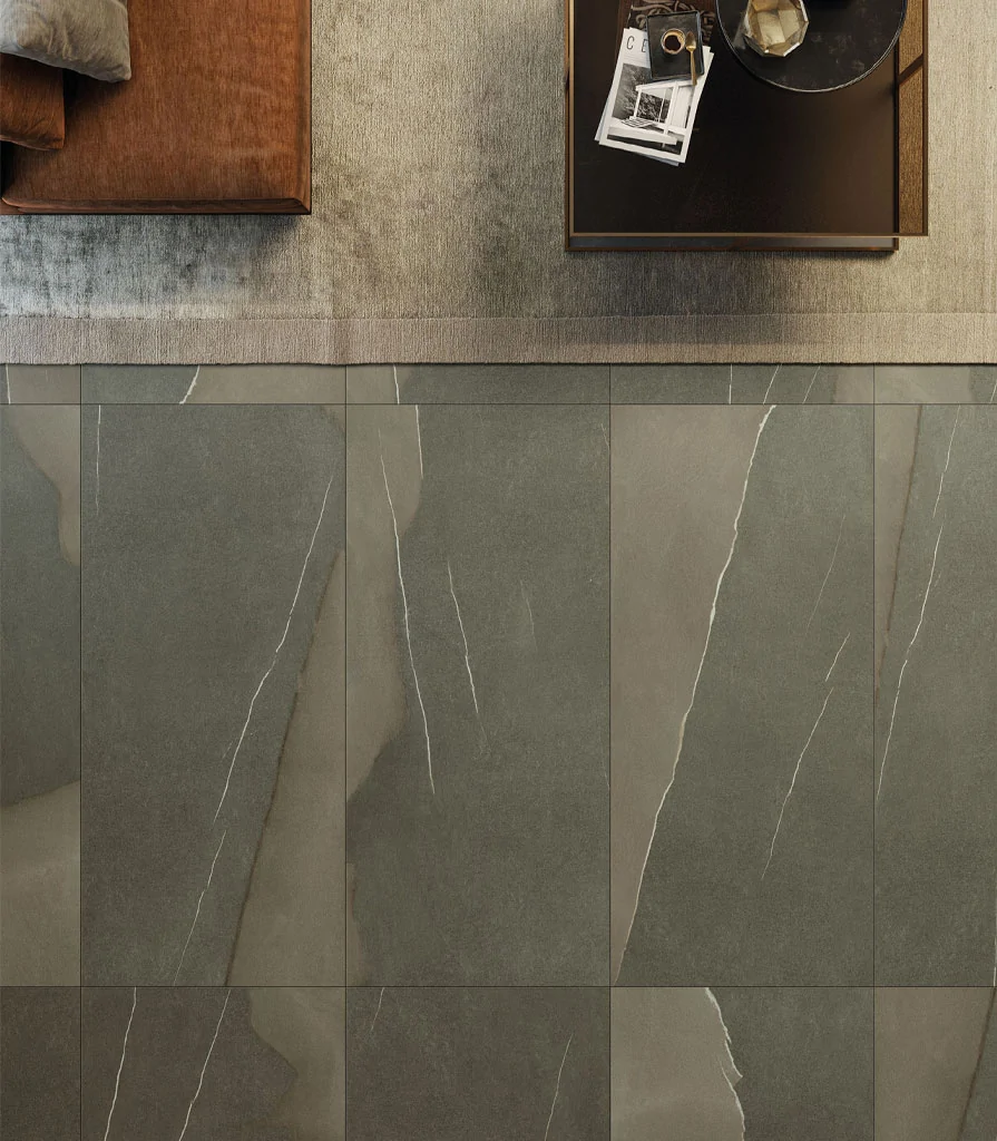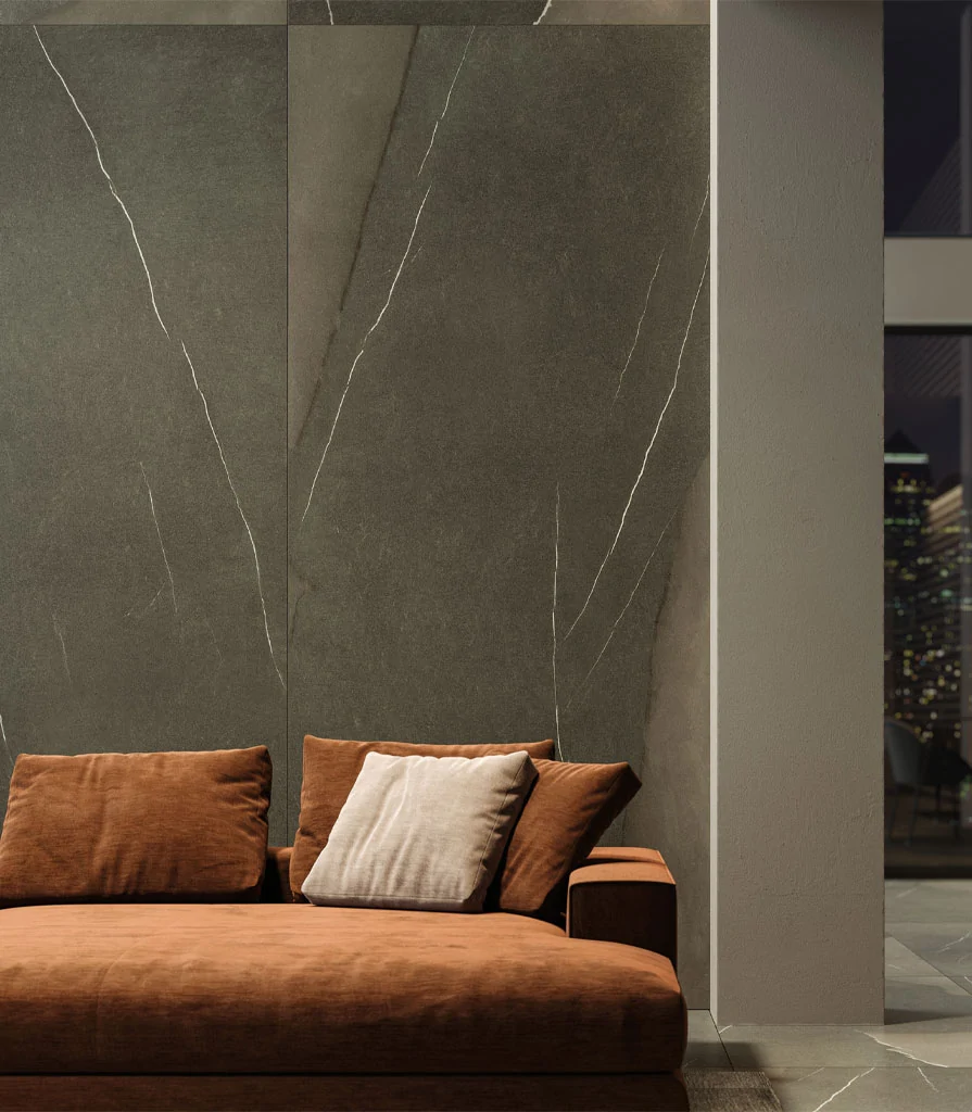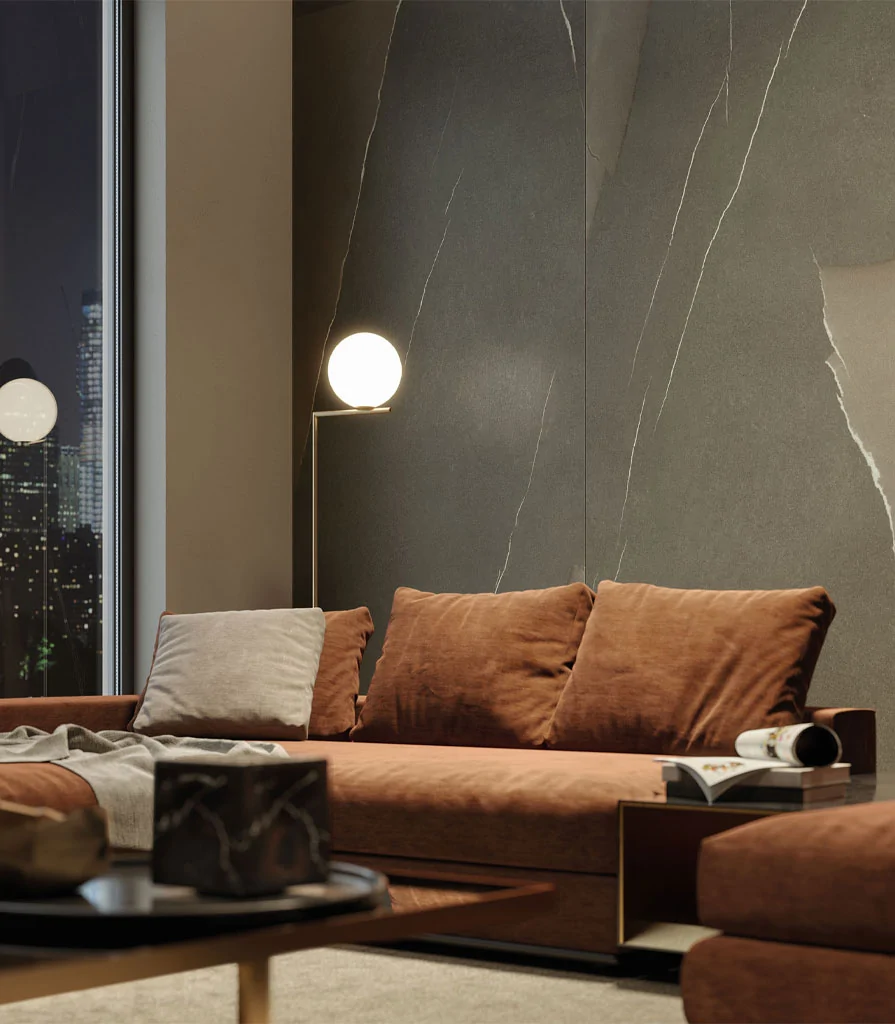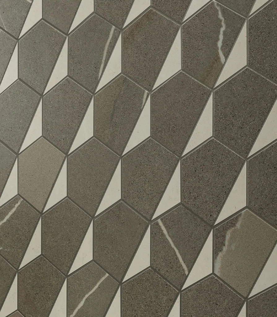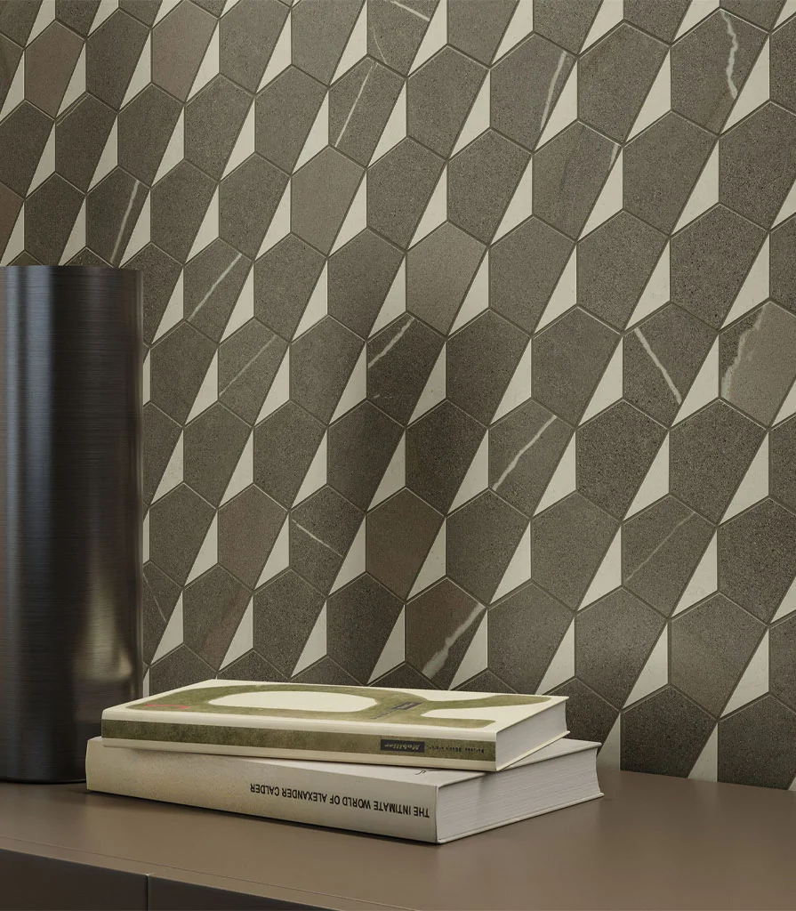 L’ambiente di questo living si distingue per ricercatezza e comfort. L’elemento chiave è rappresentato qui dal gres porcellanato bruno effetto pietra Arcadia Brown in grande formato 80×160 per la pavimentazione e in formato maxi 120×278 per il rivestimento delle pareti. La lastra di Arcadia Brown dai toni grigio-bruni, con il suo gioco di mezze ombre e morbide venature, può trasformare qualsiasi spazio. Il disegno geometrico di Hexagon, grazie alla fughe in diagonale e alle tessere esagonali, rappresenta la soluzione ideale per caratterizzare la parete d’accento del living.