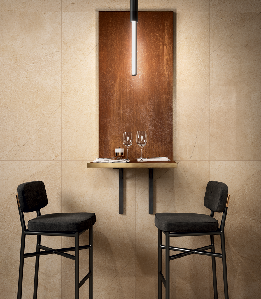 Il miglior interno di un ristorante è quello in cui si vuole tornare. Tutto è stato pensato per il comfort e il piacere dei clienti. La gamma di finiture calde crea un'atmosfera positiva e accogliente, mentre il design insolito e audace impressiona e crea emozioni. Il gres porcellanato beige effetto pietra nel colore Flare con finitura cerata fa da sfondo e mette in evidenza il Surface Corten che richiama il metallo ossidato.