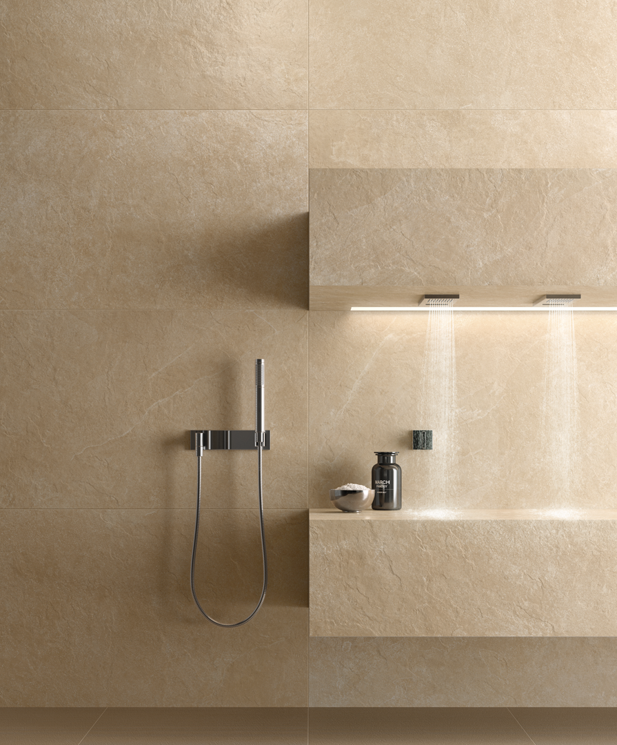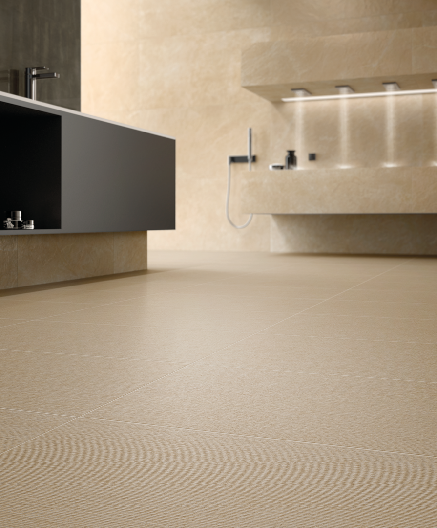 Originalità e contemporaneità grazie a una composizione creativa che coinvolge tutta la gamma di Materia. A parete, i grandi formati con finitura cerata Helio o effetto vetro Ambra e il mosaico Platinum illuminano e impreziosiscono l’ambiente con soluzioni di design audaci. A pavimento, la finitura grip dona una piacevole sensazione materica e rende sicuro l’ambiente con le sue proprietà antiscivolo. Per una spa privata che mantiene intatto il suo fascino nel tempo.