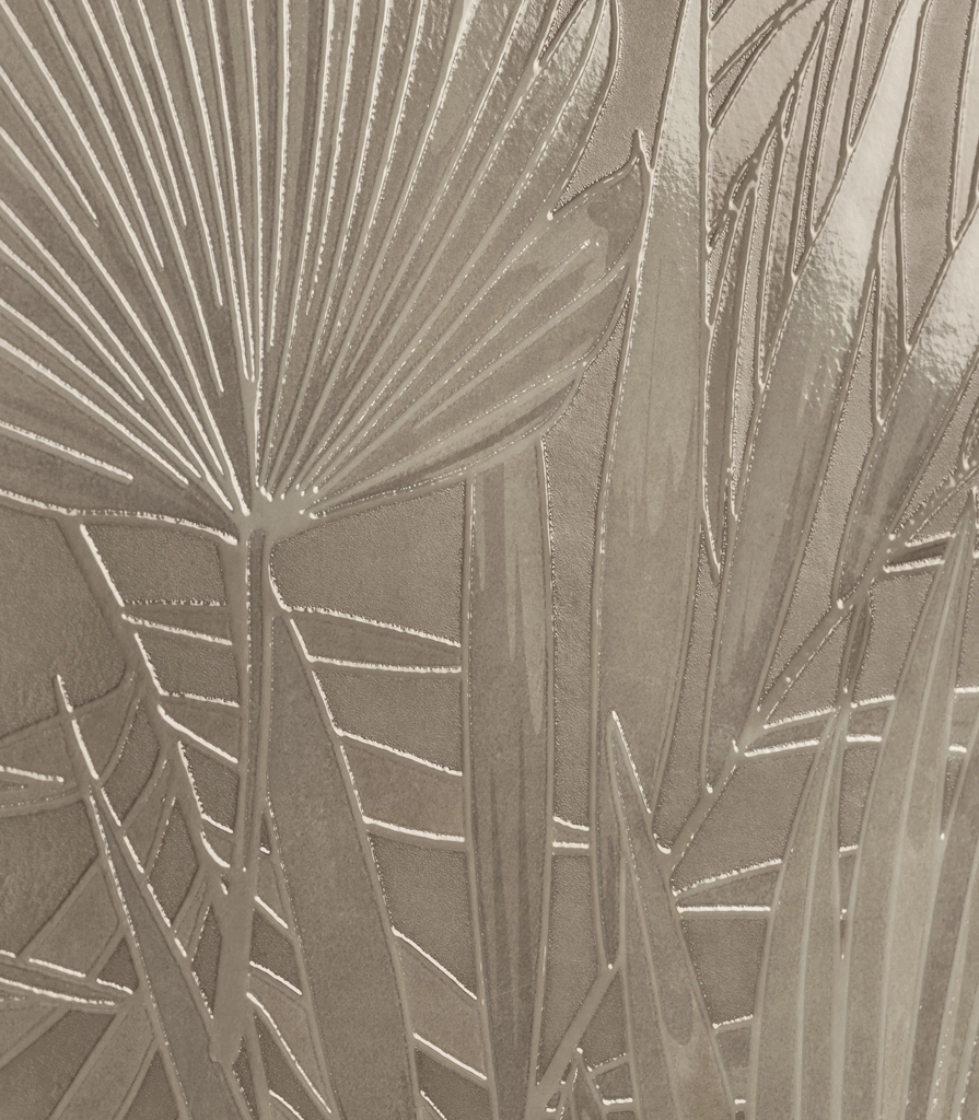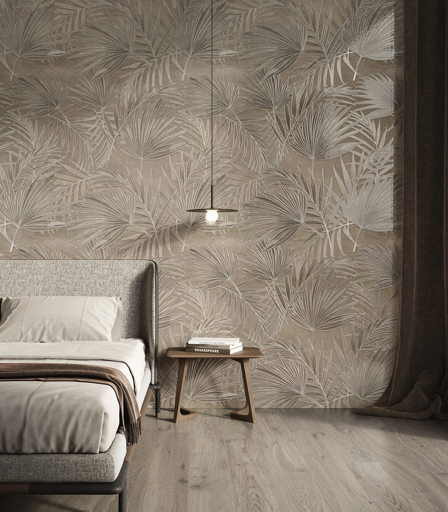 Интерьер спальни в нейтральных бежевых тонах настроит на спокойствие и расслабление. Декоративный настенный керамогранит Лас Пальмас в формате 60х120 создаст атмосферу уюта благодаря своей элегантной графике.