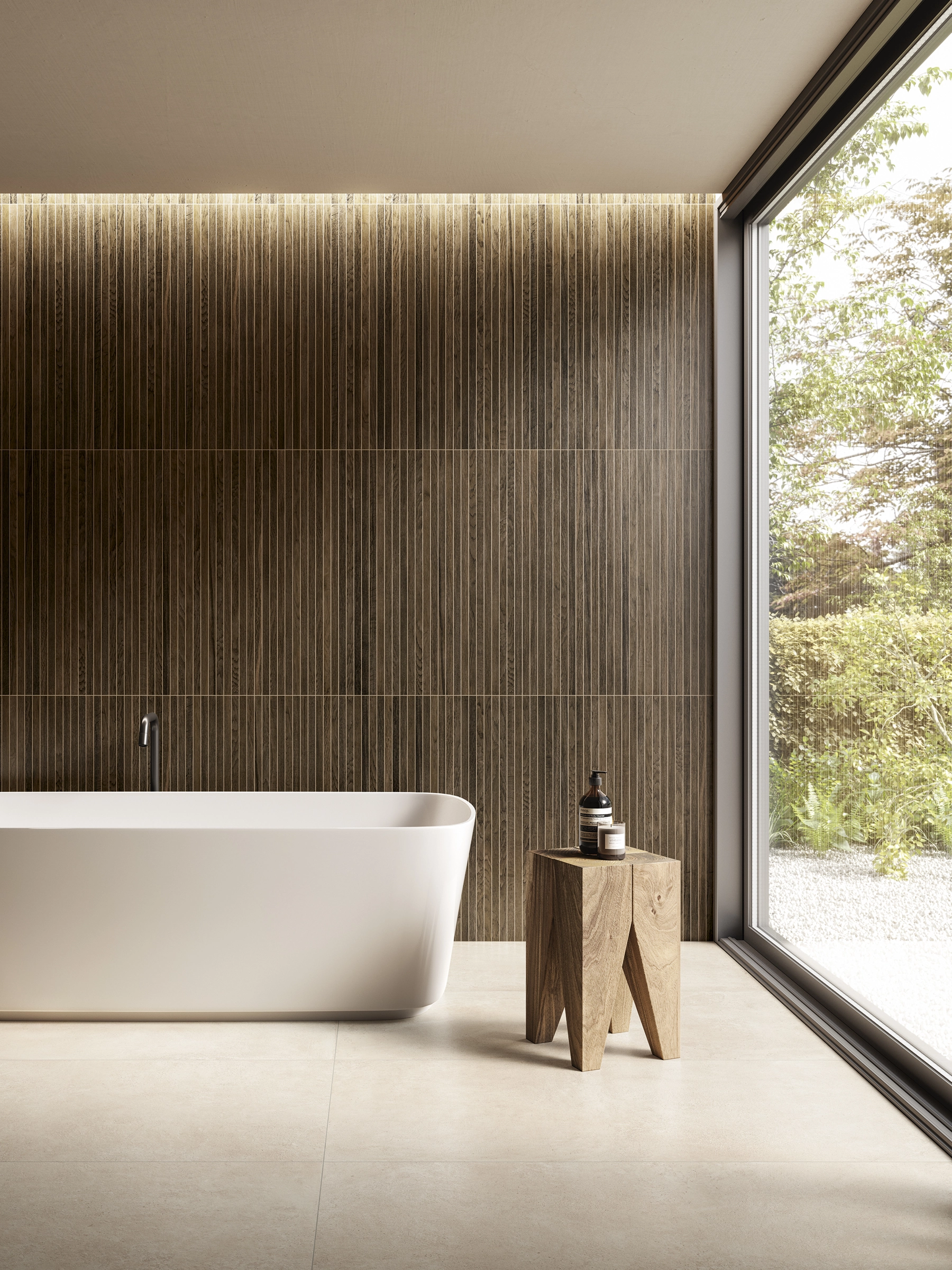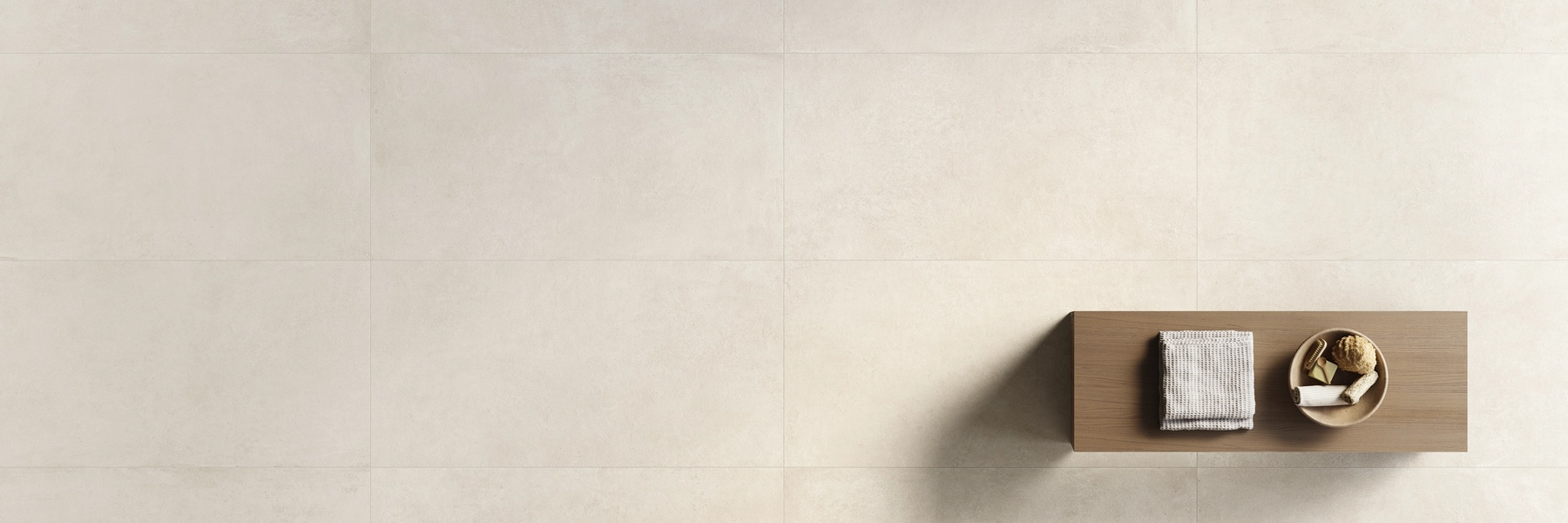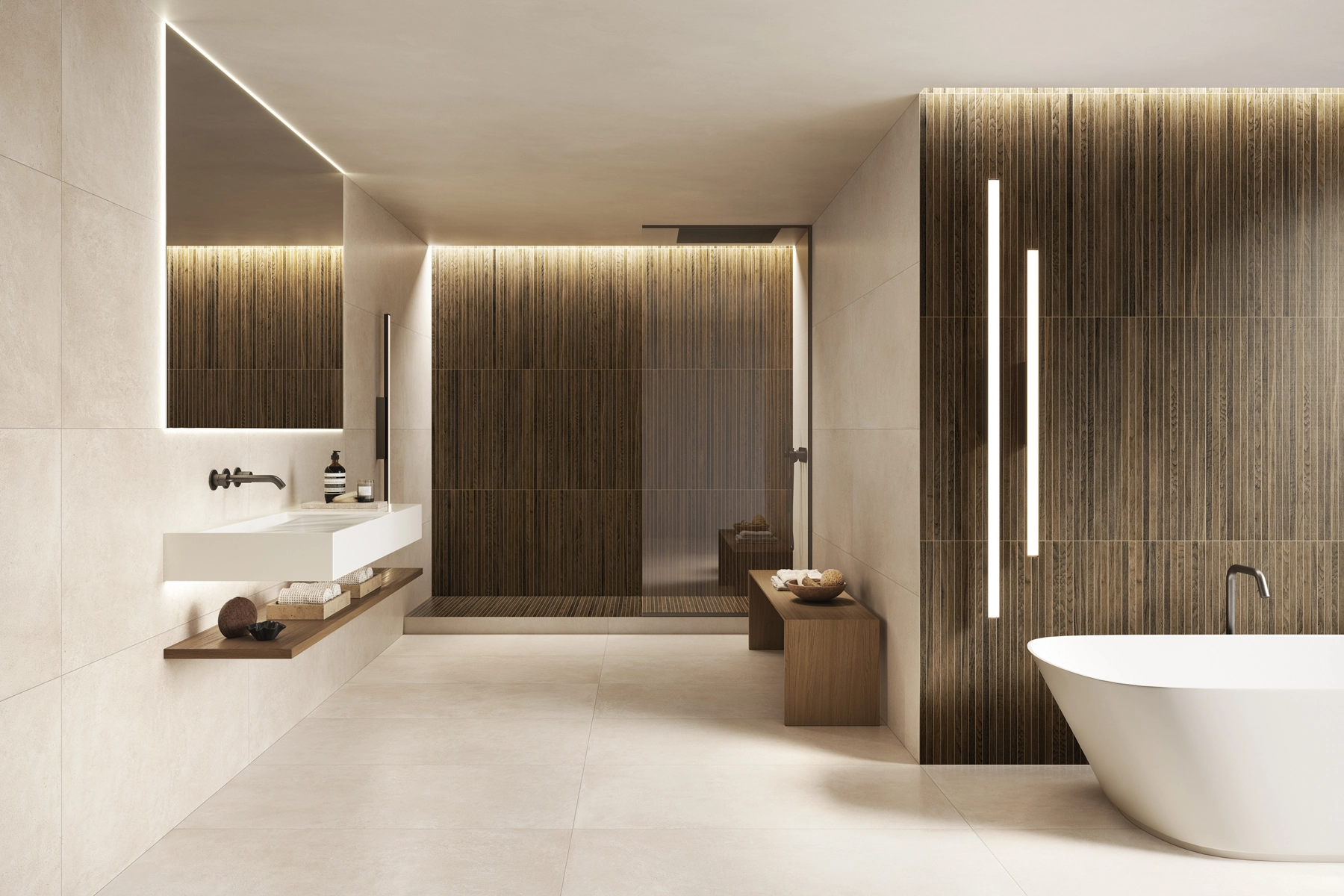 В этой элегантной ванной комнате пол и стены облицованы крупноформатным керамогранитом 60х120 с эффектом штукатурки Сноу. Плитка с натуральной поверхностью - идеальное решение для санузла.