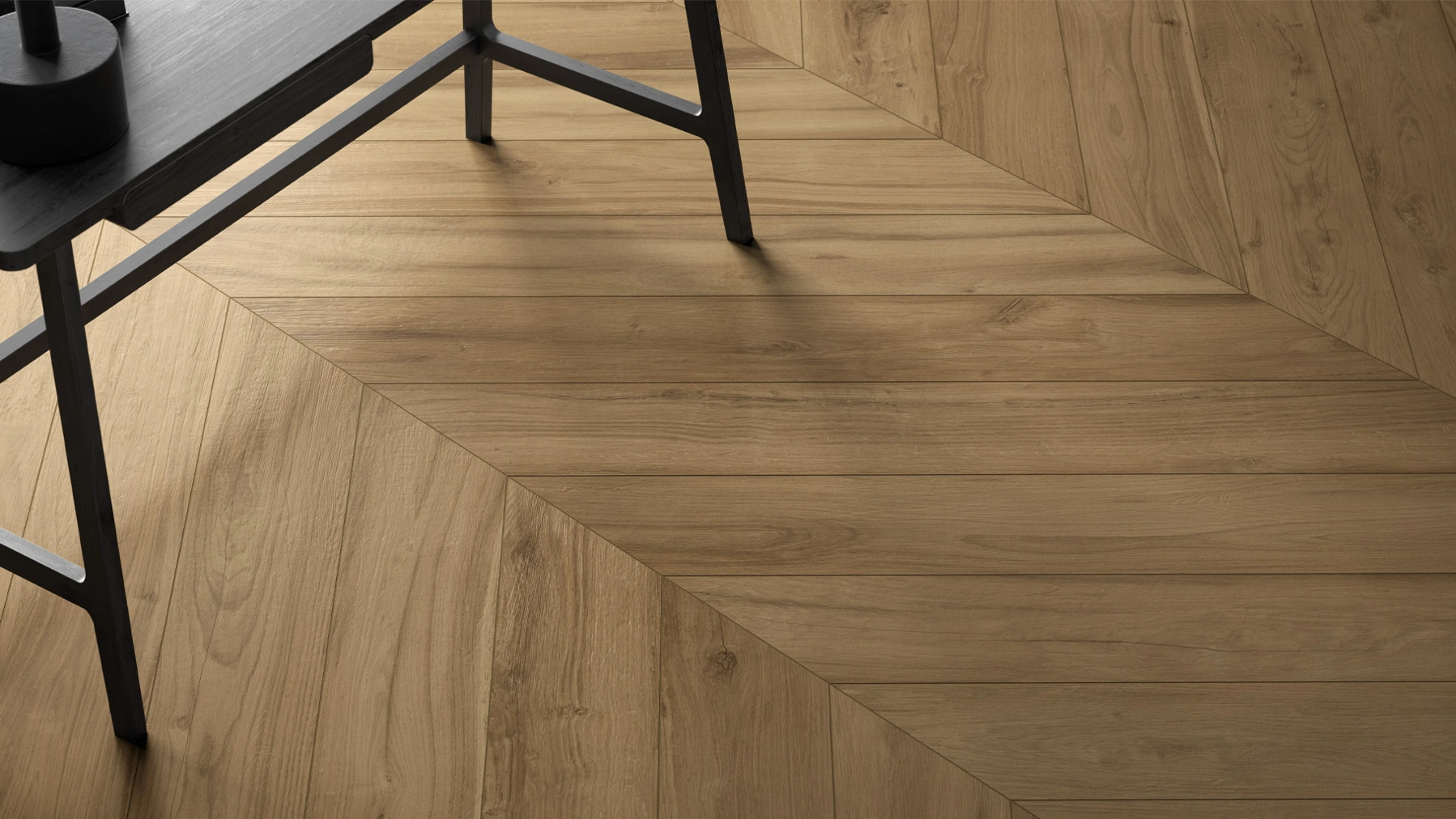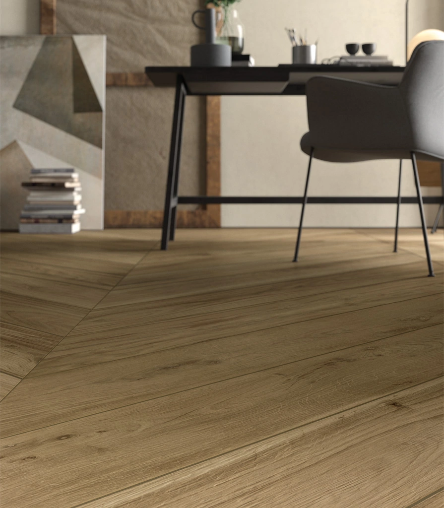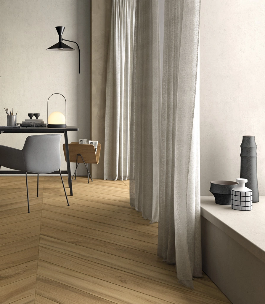Дизайн кабинета в доме выполнен в натуральных оттенках. Нейтральные светло-серые стены, теплый пол в керамограните под дерево и много естественного света…В таком интерьере легко настроиться на рабочий лад или увлеченно заниматься творчеством. Шевроны в цвете Хани 20х160, выбранные в качестве напольного покрытия, создают эффектный геометрический узор и позволяют по-новому взглянуть на плитку под дерево в современном интерьере.