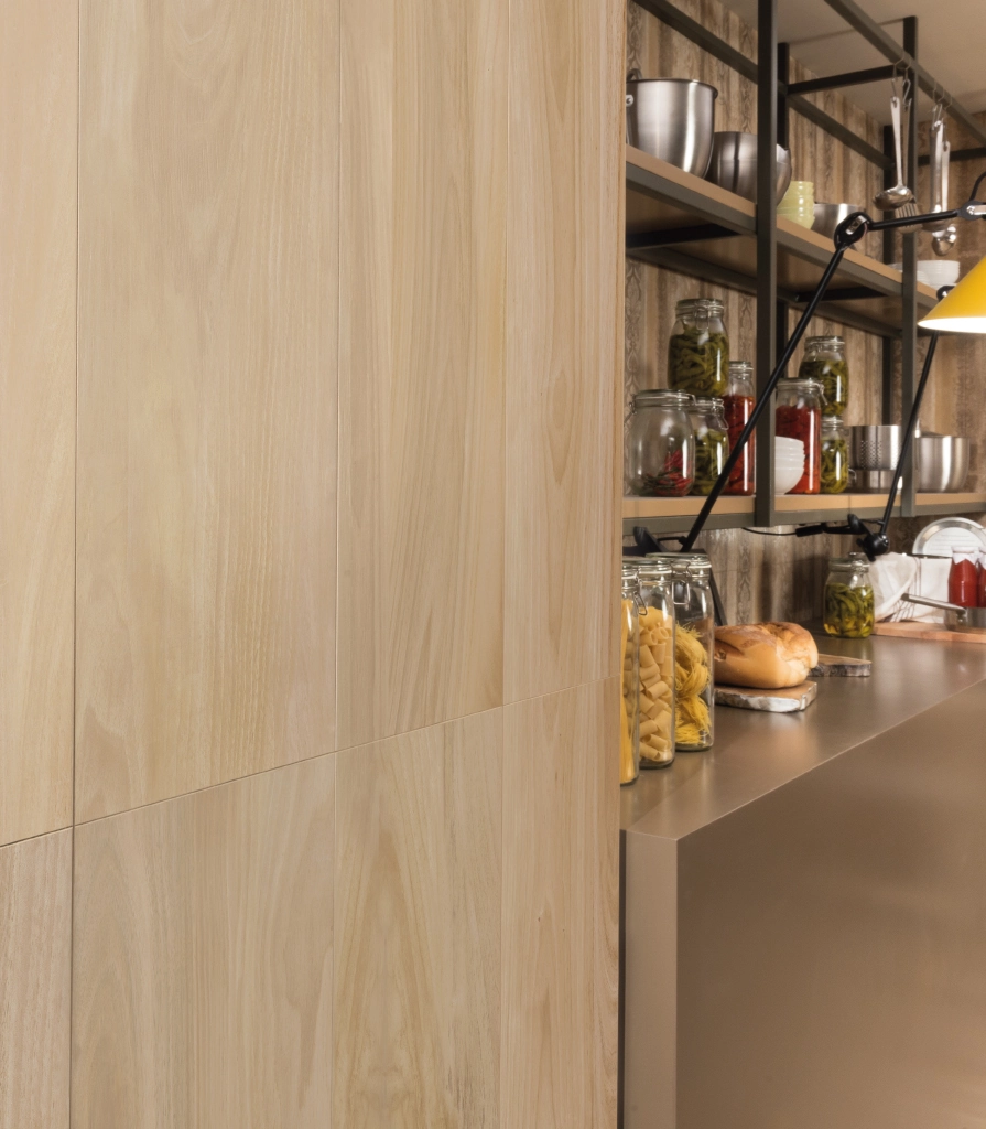 Уютный интерьер небольшого кафе-пекарни построен на сочетании теплых и нежных оттенков древесины орешника. Самый светлый цвет коллекции Хани 20х120 со стен плавно переходит на пол и в центре зала встречается с выразительным оттенком Волнат. Мультиформатная укладка керамогранита - 30x120, 20x120 и 15x120 - придает пространстау динамизм и особое очарование.