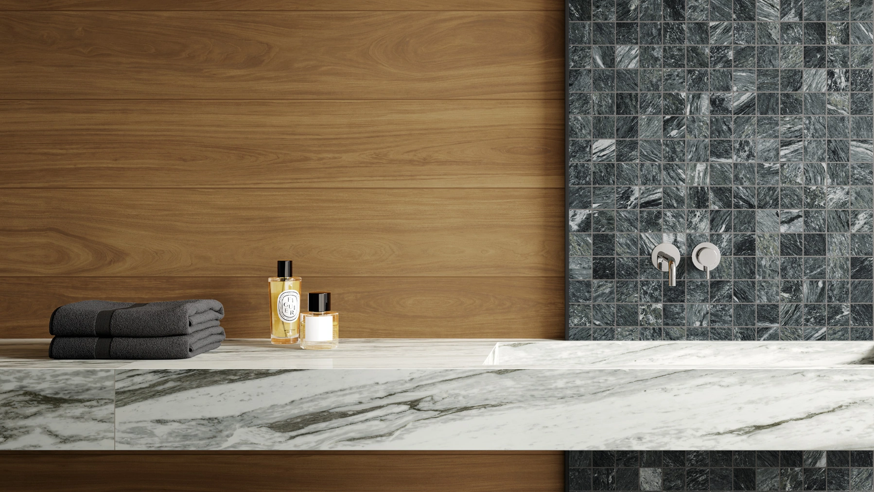 Такой дизайн ванной комнаты превращает приём душа в SPA-ритуал. Главную роль в создании расслабляющей атмосферы сыграл темный керамогранит под камень Неро Смеральдо 80х160, дополненный керамогранитом под дерево Палиссандро 20х160 в зоне отдельно стоящей ванны и раковины. Плитка большого формата на полу позволила сократить количество укладочных швов и сделать акцент на запоминающейся графике камня. Настенная плитка Мока Вставка Текстур 40x80, вдохновленная изысканными узорами жаккарда, в зоне душевой наполнила помещение теплом. Просторный интерьер ванной интересен сочетаниями текстур и цветов, которые вместе образуют уютное пространство для жизни.