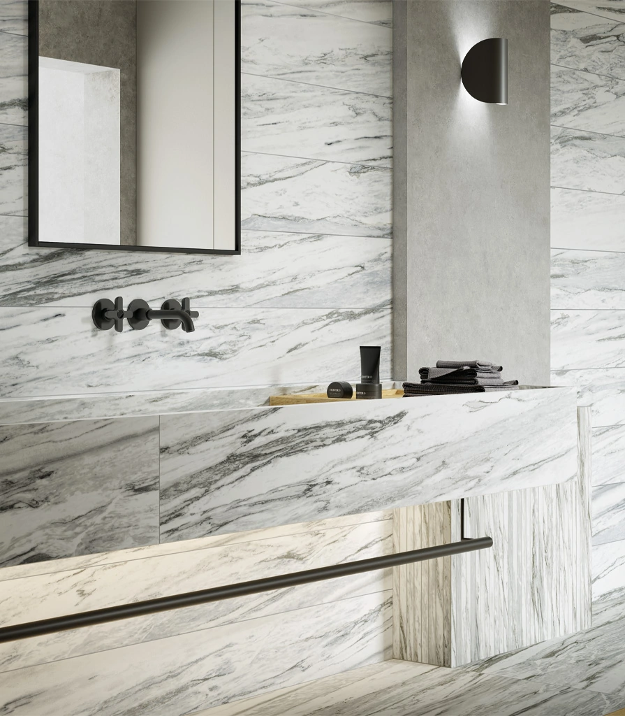 Этот ультрасовременный дизайн ванной в SPA центре основан на гармоничном сочетании белого керамогранита под камень Бьянко Парадизо в большом формате 80х160 и плитки под дерево Роверэ 20х160. Глубокие прожилки на белом фоне, вдохновленные завораживающей красотой альпийского камня, придают санузлу невероятно яркий визуальный эффект. В то время как теплая графика дерева согревает пространство и делает его уютнее. Лаконичный декор Бьянко Татами 20x80 украшает интерьер ванной и добавляет ему изысканности.
